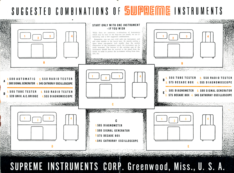 the 91 Analyzer, the Supreme Standard Diagnometer, the Model 35 Tube Tester, the Model 61 Oscillator and Model 180 Signal Generator, and more.