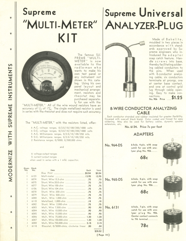 1933 Supreme Instruments Corp. Catalog - Page 14 Multi-Meter Kit, Analyzer Plug, Adapters