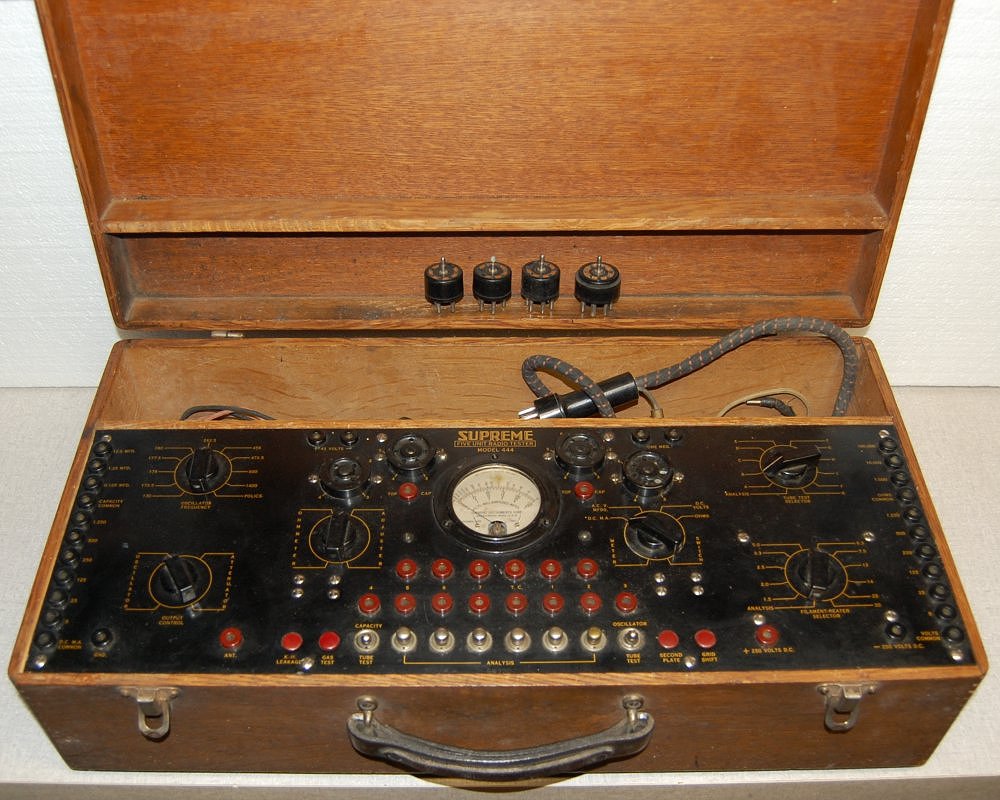 The Supreme model 400-B Radio Diagnometer has the capability to test radio tubes in and out of the circuit. It is one of the first mutual conductance tube testers and